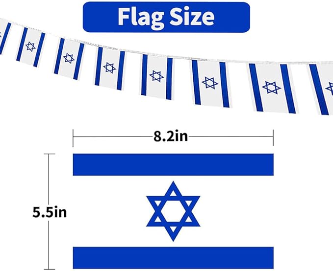 - Specifications: This small Israel flag features 30pcs flags. Each flag measures 8.2 inches long and 5.5 inches wide, attached to 38 feet long banner.
