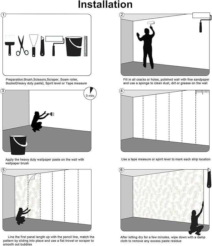 - Easy Installation 1.Fill in all cracks or holes and clean dust dirt and grease on the wall surface. 2. Apply the heavy duty wallpaper paste on the wall not mural. 3. Use a spirit level to mark each strip location. 4. match the pattern by sliding into place. 5.use a scraper to smooth out bubbles press. 6. Let dry for a few minutes and that's it! Please Note: Not self-adhesive. We recommend to use a standardized fleece wallpaper paste.