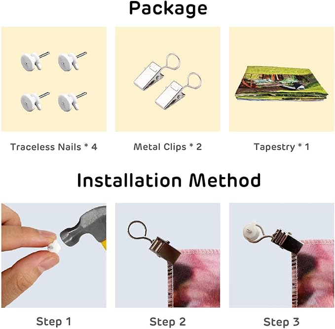 - 【PACKAGE INCLUDES】Tapestry x 1, Traceless Nails x 4, Metal Clips x 2