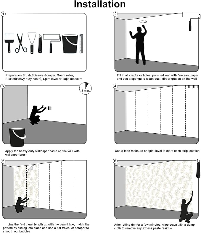 - Easy Installation 1.Fill in all cracks or holes and clean dust dirt and grease on the wall surface. 2. Apply the heavy duty wallpaper paste on the wall not mural. 3. Use a spirit level to mark each strip location. 4. match the pattern by sliding into place. 5.use a scraper to smooth out bubbles press. 6. Let dry for a few minutes and that's it! Please Note: Not self-adhesive. We recommend to use a standardized fleece wallpaper paste.