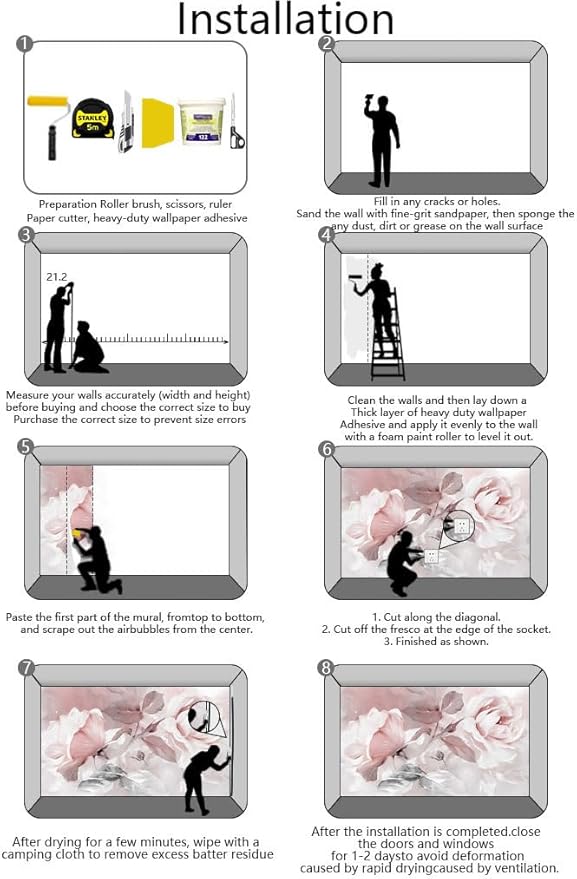 - Installation steps 1. Fill in any cracks or holes and clean the surface of the wall of dust, dirt and grease.2. Apply heavy-duty wallpaper paste to the wall, not the mural.3. Mark the position of each strip of wallpaper with a spirit level.4. Align the pattern and slide it into place.5. Scrape the bubbles with a spatula.6. Let it dry for a couple of minutes and it's ready to go!