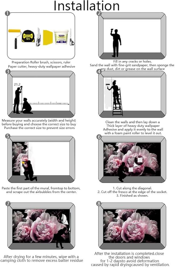 - Installation steps 1. Fill in any cracks or holes and clean the surface of the wall of dust, dirt and grease.2. Apply heavy-duty wallpaper paste to the wall, not the mural.3. Mark the position of each strip of wallpaper with a spirit level.4. Align the pattern and slide it into place.5. Scrape the bubbles with a spatula.6. Let it dry for a couple of minutes and it's ready to go!