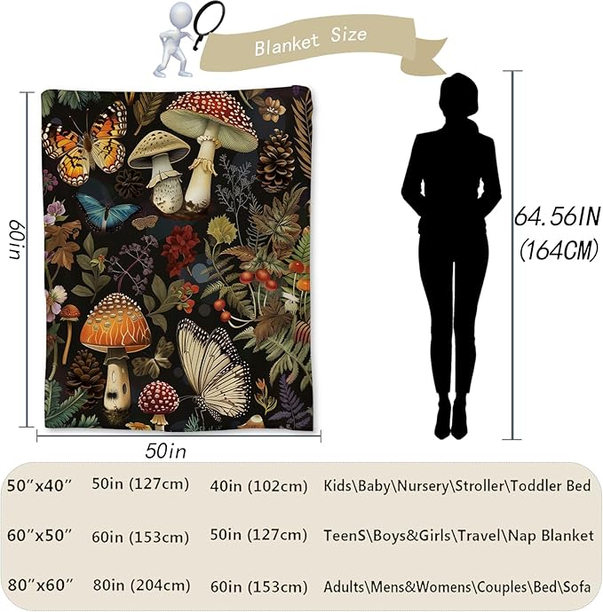 - [Enchanting Mushroom and Butterfly Design]Wrap yourself in the mystical world of our flannel blanket, featuring an intricate and colorful depiction of various mushrooms and butterflies. This enchanting design showcases a rich collection of flora and fauna, including detailed illustrations of mushrooms in a variety of shapes and sizes, complemented by beautifully rendered butterflies and lush botanical elements.