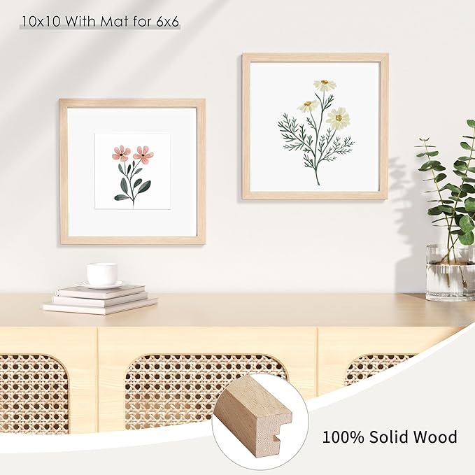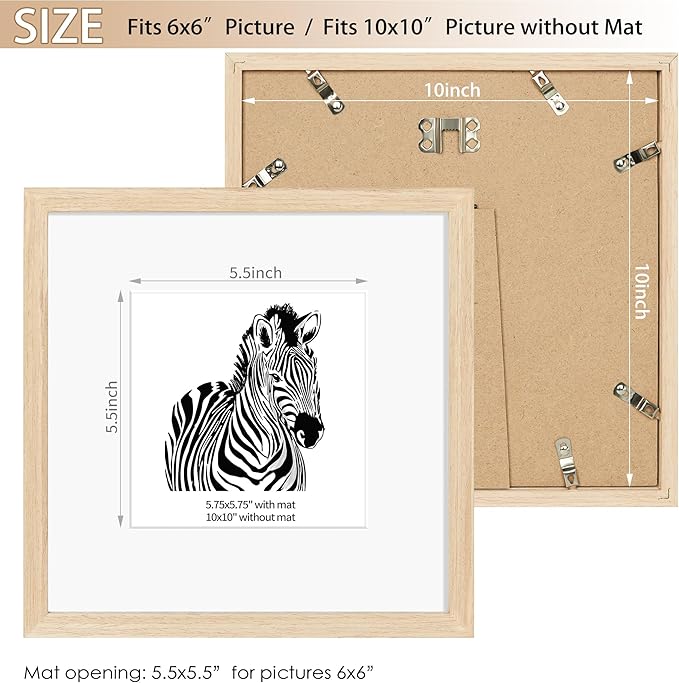 - SIZE INFORMATION: this 10 by 10 frame is designed to display 2 sizes of pictures. Showcase 10x10" prints without paper mat, or display 6x6 inches picture with the paper mat included