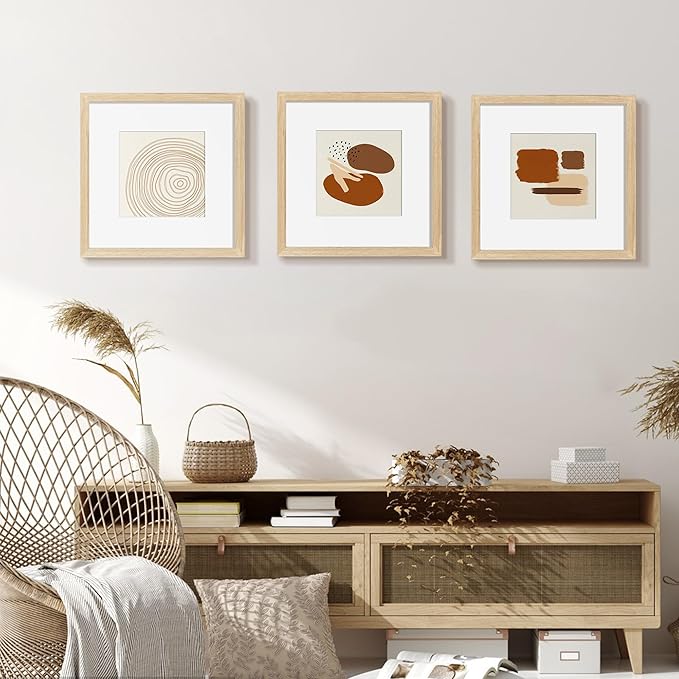 10x10 Picture Frame Made with Solid Wood Set of 3, Display 6x6 with Mat or 10x10 without Mat, Wall Gallery Frame Set with Tempered Real Glass, Tabletop or Wall Mounting Display (3 Pack of Oak)