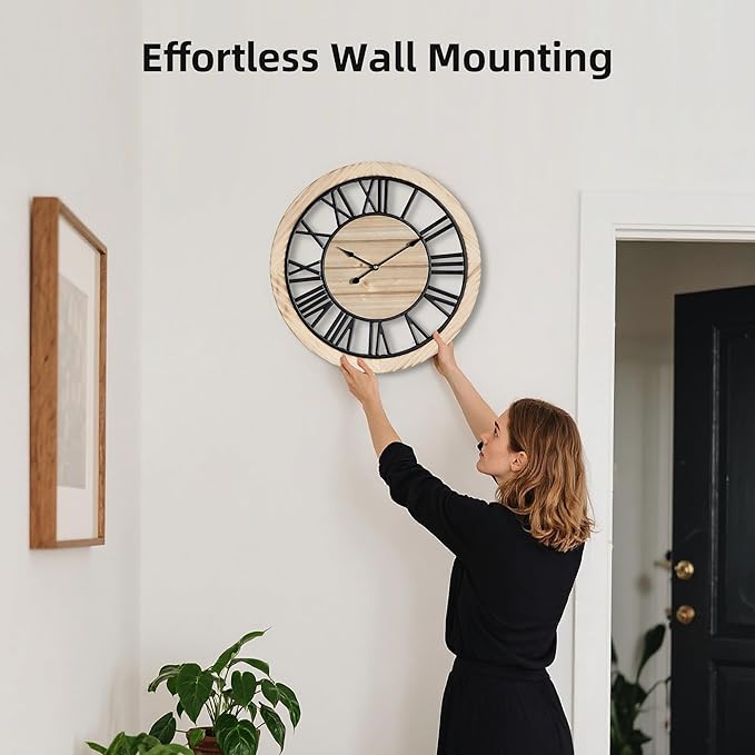 - 【Rustic Design with Wood and Metal Materials】 - Crafted with a real wooden frame and sturdy metal details, this farmhouse wall clock blends rustic charm with modern durability. Available in 4 sizes and 2 hand styles—Roman and Arabic numerals—you’ll find the perfect fit for any room. Please measure your wall space BEFORE PURCHASE to ensure the right size.