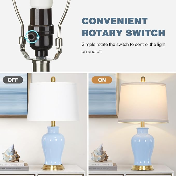 - 【Superior Quality 】The light blue ceramic table lamp is made of high-quality ceramic with smooth and shiny surface, durable, scratch-resistant and will not fade. The gold metal base adds a touch of luxury. Elegant coastal table lamps can enhance the overall beauty of your home decor. The modern design adds character and warmth to your house, creating a cozy ambiance