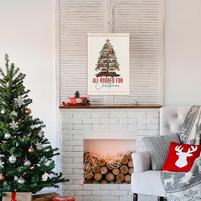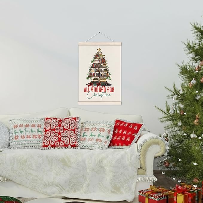 Vintage Christmas Reading Poster Hanger with Wood Frame, All Booked for Christmas Wall Art Decor for Home, Xmas Book Tree Posters for Reading Room Home Library Decor, 12x16 Inch