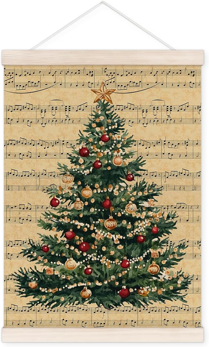 Vintage Christmas Tree Poster Hanger with Wood Frame, Retro Christmas Music Sheet Wall Art Decor for Home, Farmhouse Rustic Winter Xmas Tree Posters for Bedroom Living Room Decor, 12x16 Inch