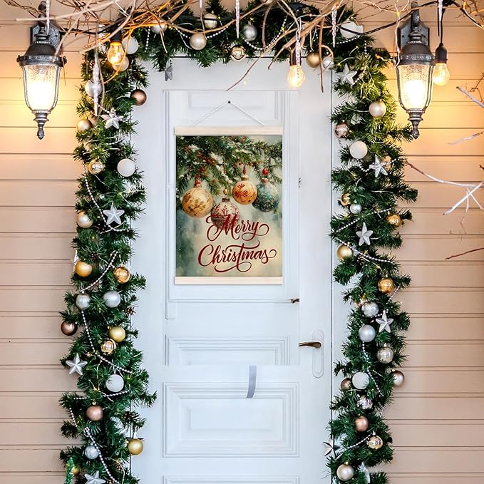 Merry Christmas Poster Hanger with Wood Frame, Winter Christmas Ornaments Bauble Ball Wall Art Decor for Home, Cottagecore Winter Xmas Posters for Bedroom Living Room Decor, 12x16 Inch