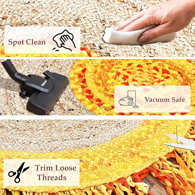 - Rug Care: Vacuum your rug a few times a week on a low setting. Use a mild detergent to spot clean as needed. Made from plant fibers, it's normal for some sprouting or loose threads—trim them with scissors. Be sure to clean under the rug often.