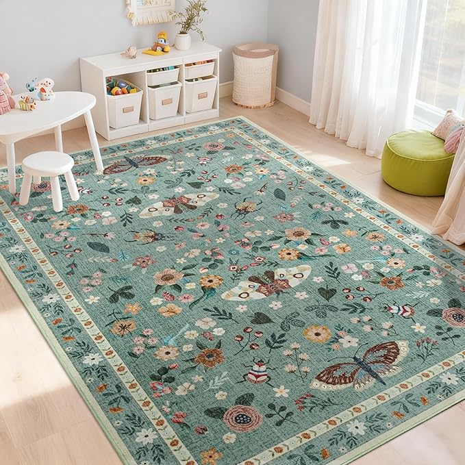 6x9 Rug for Living Room, Washable Area Rugs for Bedroom, Soft Non Slip Indoor Low Pile Carpet for Dining Room, Large Throw Floral Butterfly Carpets for Office Nursery Home Decor, Light Green